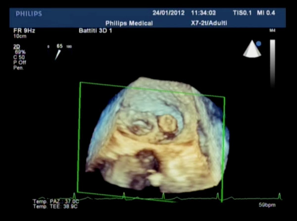 This 3D image shows a vascular plug implanted in a lateral leak of the mitral valve. The role of echo imaging is of paramount importance in this field.