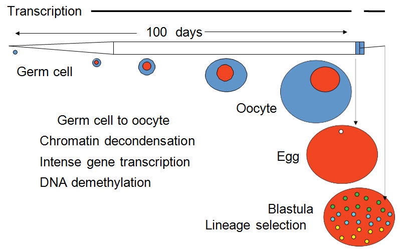 The Xenopus oocyte grows in the ovary from a germ cell over many months while it is in first meiotic prophase. When fully grown it can respond to hormones, such as progesterone, to complete first meiosis and arrest in second meiotic metaphase. Once fertilized, it progresses to the blastula stage in 8 hours and somatic lineages already start to appear.