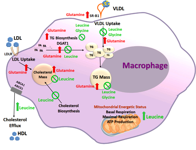 Leucine and glycine significantly prevented triglyceride accumulation in macrophages, by inhibiting triglyceride-rich very-low-density lipoprotein (VLDL) uptake and triglyceride biosynthesis rate, while glutamine showed the opposite effects, accompanied by a concurrent upregulation of diacylglycerol acyltransferase-1 (DGAT1). Leucine also decreased macrophage cholesterol content by inhibiting the rate of cholesterol biosynthesis and increasing serum-mediated cholesterol efflux from macrophages, whereas glutamine increased the uptake of cholesterol-rich low-density lipoproteins (LDL), with concomitant accumulation of cholesterol mass. Macrophage mitochondrial respiration and ATP production were improved after leucine supplementation. Red-colored up-arrows (indicating increase or upregulation) and compounds names, designate pro-atherogenic effects; green-colored up-arrows, crossed circles (indicating decrease or inhibition), and compounds names, designate anti-atherogenic effects. ABCA1, ABCG1, ATP-binding cassette subfamily A or G member 1; DGAT1, diacylglycerol acyltransferase-1; FA, fatty acids; HDL, high-density lipoprotein; LDL, low-density lipoprotein; LDLR, LDL receptor; SR-B1, scavenger receptor type B-1; TG, triglycerides; VLDL, very-LDL.
