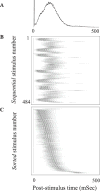 The effects of stimulation on these networks have also been extensively studied. It has been shown that extracellular electrical stimulation from spatially different sources elicits prototypical responses in the form of network spikes. These spikes exhibit two distinct phases of response – an early, directly activated response in which action potential latencies are well preserved and a later, “downstream” phase elicited by reverberation of activity which is very variable.29,30 Each neuron typically fires many action potentials in each network spike as it is being activated by many different propagation pathways (Figure 2).  | Figure 2The evoked network spike (NS). All the panels are examples from a single experiment. A: An example of a single, stimulus-evoked NS. Each line is a raster plot of a single electrode. B: Population firing rate profiles of NS (population-count-histogram (more ...) |
