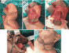 The supraclavicular artery island flap is marked in the supraclavicular area, with the artery marked in the triangle formed medially by the posterior border of the sternocleidomastoid muscle, laterally by the external jugular vein, and inferiorly by the clavicle. A 6 cm × 22 cm flap is marked after testing skin pinchability for primary closure. Marking of the lateral flap edge can be extended 2 cm lateral to the deltopectoral groove; beyond this care should be exercised as the blood supply to the flap becomes unstable. The flap is raised in a sub-fascial plane over the deltoid muscle and extended to the pivot point at the previously marked triangle. Care should be taken when performing a neck dissection at level IV to preserve the supraclavicular pedicle. The supraclavicular artery island flap is fasciocutaneous. Color matching is excellent for neck and face defects, and donor site morbidity is minimal.20 However, using the distal part of this flap is usually precarious as it has an unreliable blood supply. In our series, five patients developed partial flap necrosis, and one developed total flap necrosis. All these flaps were debrided and managed conservatively. The patient with complete flap necrosis was managed with a skin graft. The infrahyoid flap. Figure 6 shows the steps involved for using the infrahyoid flap.